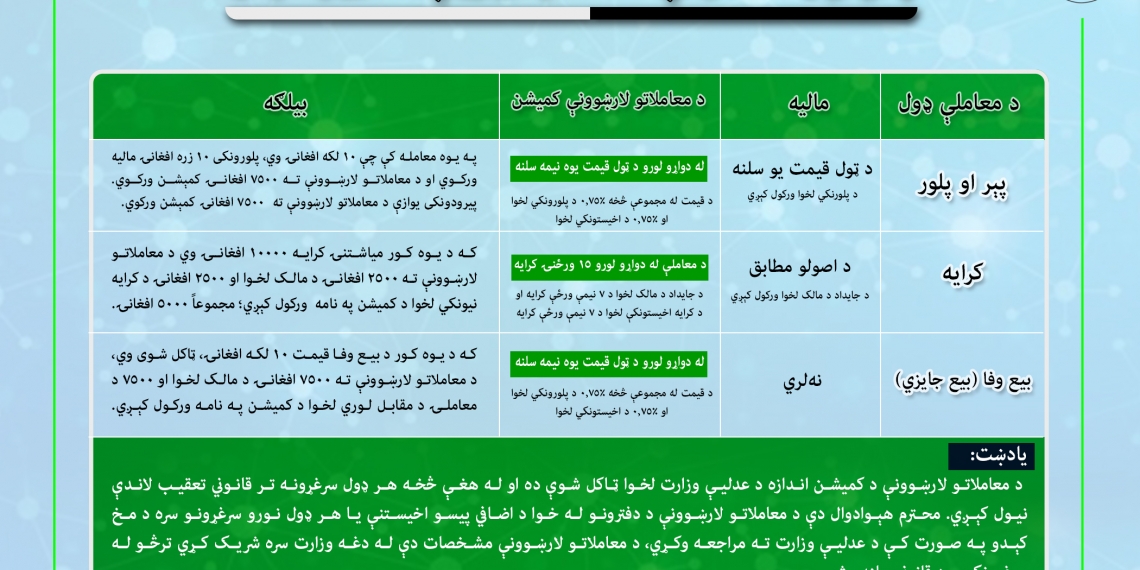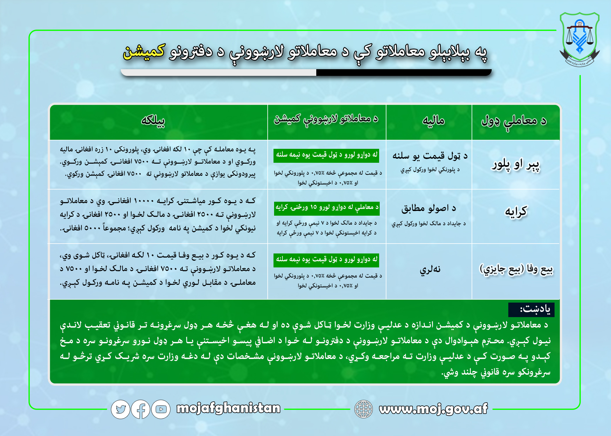 عدلیې وزارت د رهنمای معاملو د کمیشن لپاره نوي اصول اعلان کړي دي. د عدليې وزارت څخه په خپرو شويو يادو اصولو او مقرراتو کې راغلي، چې په کرایي معاملو کې د رهنمای دفتر کمیشن د یوې میاشتې د کرايي نیمايي ټاکل شوی چې دواړه لوري (مالک او کرایهدار) یې په مساوي ډول ورکوي. یعنې د کرایې اوو نیمو ورځو په اندازه پیسې د کمیشن په نوم د دواړو خواوو له خوا ورکول کېږي.
