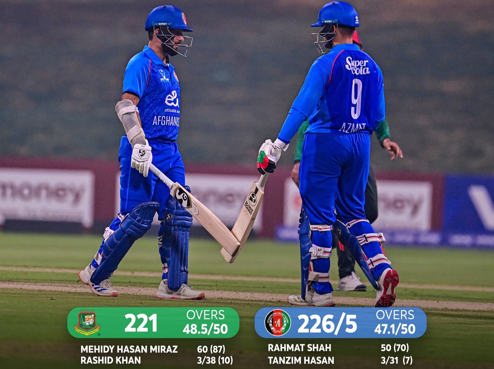 بنګلهدېش د ټولو لوبغاړو په سوځېدو سره افغان لوبډلې ته د ۲۲۲ منډو هدف ورکړی و، خو افغان لوبغاړو دغه هدف د لوبې په ۴۷م اور کې د پنځو لوبغاړو په سوځېدو سره پوره کړ.