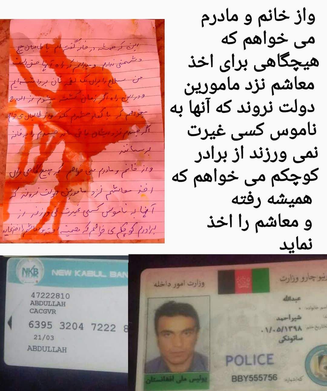 من سلاح را برای یک لقمه نان برداشته ایم ودر این راه اگر زمان کشته میشوم از الله ج میخواهم که با کفار حشرم نکند و از طالبان می خواهم اگر جسدم نزد ایشان باقی ماند جسدم را به خانه ام برسانند