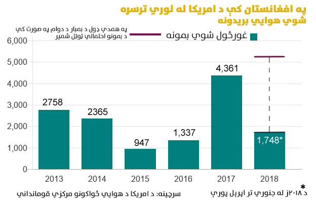 بي بي سي زیاته کړې، د تېر کال په اګست میاشت کې د ولسمشر ډونلډ ټرمپ له لوري د افغانستان لپاره د سټراټيژۍ تر اعلان او د نورو اضافي عسکرو تر رالېږل کېدو وروسته، په افغانستان کې د امریکايي هوايي ځواکونو له لوري د بمونو په غورځولو کې په بېساري توګه زیاتوالی راغلي.