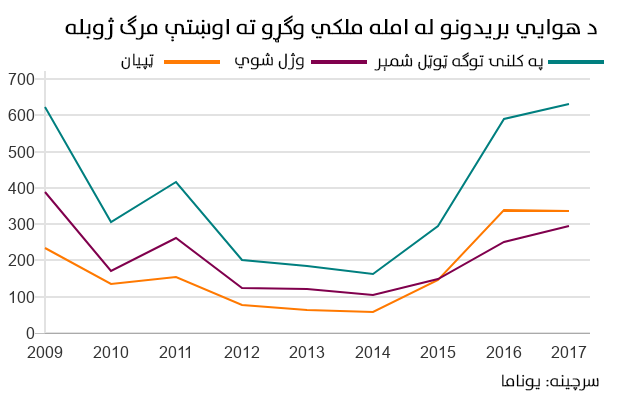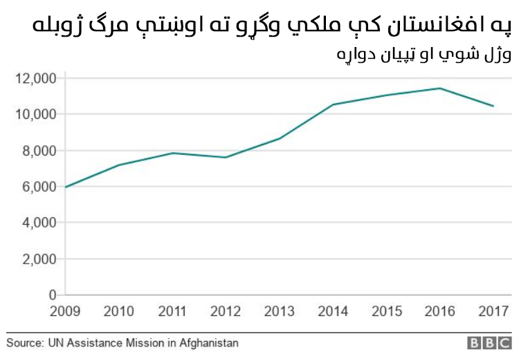 بي بي سي په یوه تازه رپورټ کې ویلي چې ۲۰۱۷ز کال د تېرو اتو کلونو په پرتله پر طالبانو او داعش ډلې د درنې بمبارۍ له امله ملکي وګړو ته تر ټولو خونړی کال و.