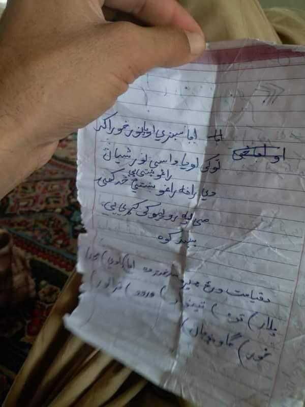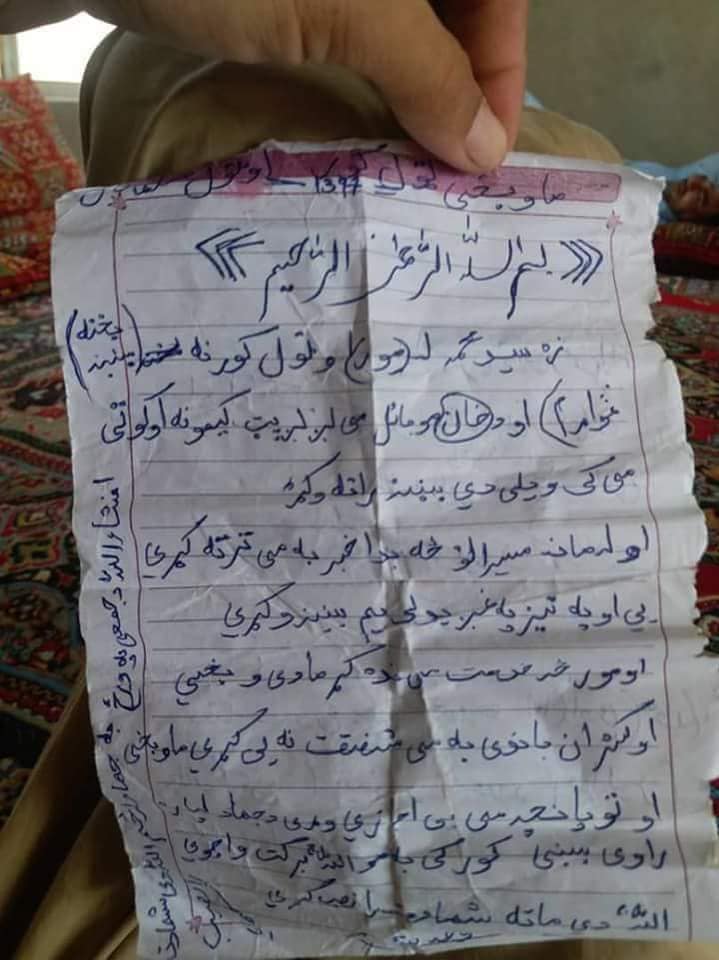 او له ما نه مشرانو څه بده خبره به مې درته کړي یې او په تیز غږ به مې خبرې درته کړي وي بښنه راته وکړئ. ما د مور څه خدمت نه دی کړی بښنه راته وکړئ، په کشرانو به مې شفقت نه وي کړی بښه دې راته وکړئ. او تومانچه مې بې اجازې وړې د جهاد لپاره الله به مو په کور کې برکت واچوي بښنه راته وکړئ الله جل جلاله دې ماته شهادت رانصیب کړي.