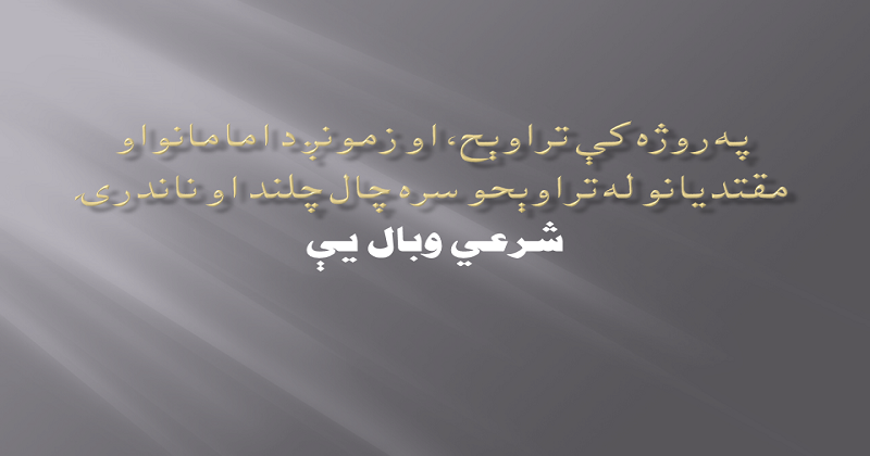 ژباړه: له ابوهُريره رضي الله عنه څخه روايت چې : رسول الله صلی الله عليه وسلم به مسلمانانو ته د روژې په مياشت کې د ماسخوتن له لمانځه څخه وروسته د قيام یا تراويحو د لمانځه ترغيب ورکولو بې لدې چې د فرضو په څېر سخت حکم ورته وکړي، بيا به يې فرمايل چې ، څوک د روژې په مياشت کې د شپې قيام تراويح په ايمان او د ثواب په نيت سره وکړي نو مخکني ګناهونه به يې ورته وبخښل شي ، بيا د رسول الله صلی الله عليه وسلم تر وفات پورې همداسې بې له جَمعې څخه تراوېح کېدلې، د ابوبکر رضي الله عنه په خلافت کې هم همداسې وې، د عمر د خلافت په اول سر کې هم همداسې ( مسلم ، بخاري. ، ترمذي)