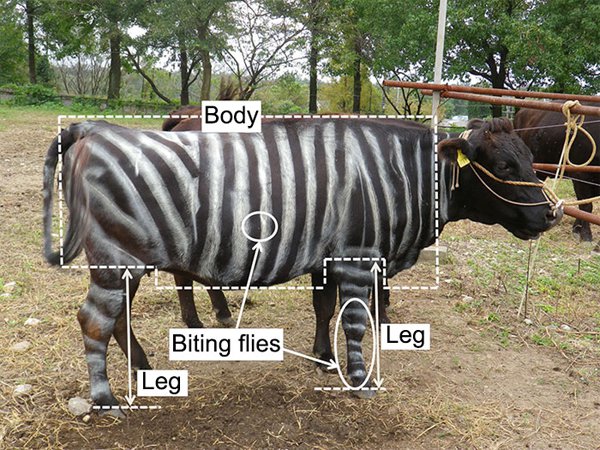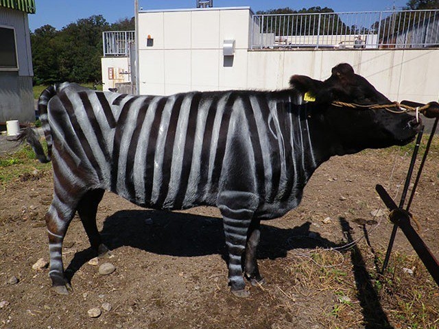 دا کامیابه څېړنه “توموکی کوجیما” په مشرۍ د “جوایچي” زراعتي فارم کې پر غواګانو شوي لومړي سر کې غواګانې په دوه ګروپونو ویشل شوي دي لومړي ګروپ ته بې ضرره سپین رنګ ورکول شوي او دوهم ګروپ ته د غواګانو په ټوله تنه سپینې کرښې ایستل شوي دي، څېړونکي وايي، هغه غواګانې چې سپین رنګ یا مکملې تور رنګ درلود د خزندګانو حملې پرې ډیرې وي او غواګانې ډیرې ناراحته وي خو دوهم ګروپ چې په تنه يې سپینې کرښې ایستل شوي وي ارامې او د خزندګانو حملې تر ۵۰ فیصده پورې کمې وي.