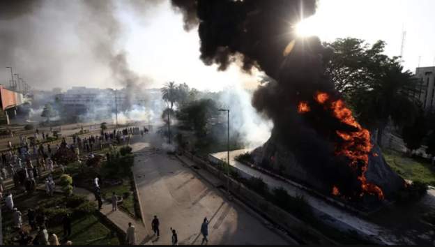 د پاکستان د مخکني صدراعظم عمران خان د نیونې په اعتراض کې د پاکستان په بېلابېلو ښارونو کې اعتراض کوونکو د پوځ او پولیسو پر مرکزونو یرغلونه وروړي او سوځولي یې دي. د پاکستاني رسنیو د راپورونو له مخې، لسګونو زرو اعتراض کوونکو پرون په ټول پاکستان کې د عمران خان د نیول کېدو خلاف لاریونونه پیل کړي چې له کبله یې په لویو ښارونو کې ګډوډۍ پېښې شوي او امنیتي ځواکونو او لاریون کوونکو ته مرګ ژوبلې اوښتي دي. عمران خان، پرون وروسته له دې ونیول شو چې په اسلام اباد کې یوې محکمې ته له حاضرېدو وروسته د فساد په څو تورونو ونیول شو. عمران خان په داسې حال کې ونیول شو چې ګڼ شمېر پولیس او ملېشه ځواکونه یې شاوخوا ولاړ وو او دی یې یوه تور واګون ته پورته کړ.
