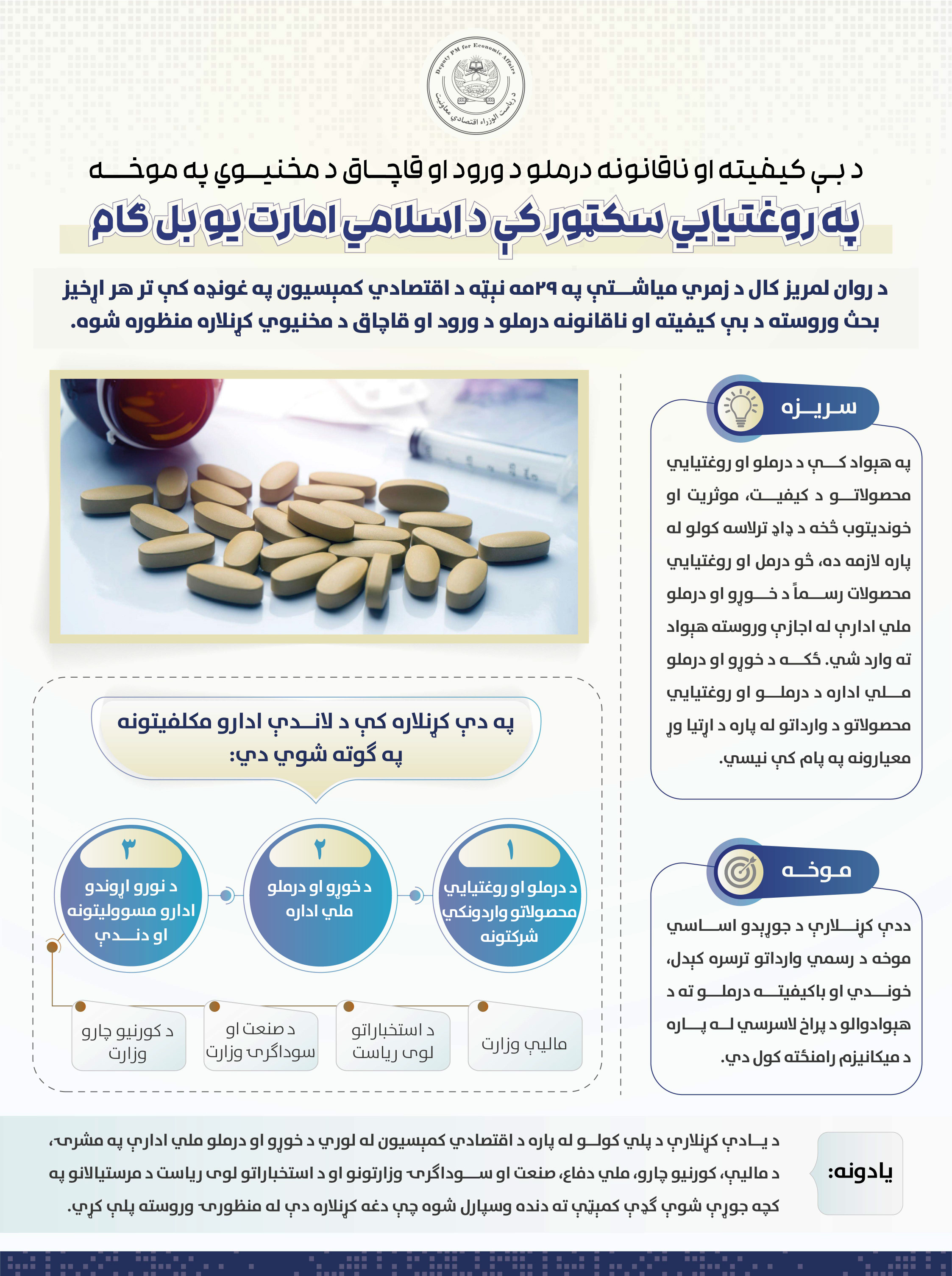 د روان لمري کال د زمري د مياشتې په ۲۹مه نېټه د اقتصادي کمېسيون په غونډه کې تر هر اړخيز بحث وروسته د بې کيفيته او ناقانونه درملو د ورد او قاچاق د مخنيوي کړنلاره منظوره شوه.